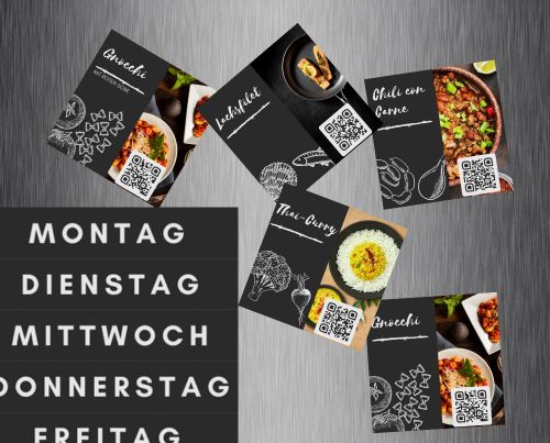• Zusätzliche Mini-Magnete für die Wochentage: Zusätzlich zu den Rezeptmagneten erhältst du 5 Mini-Magnete mit den Wochentagen, um die Planung noch einfacher zu gestalten.